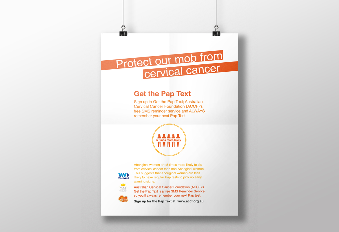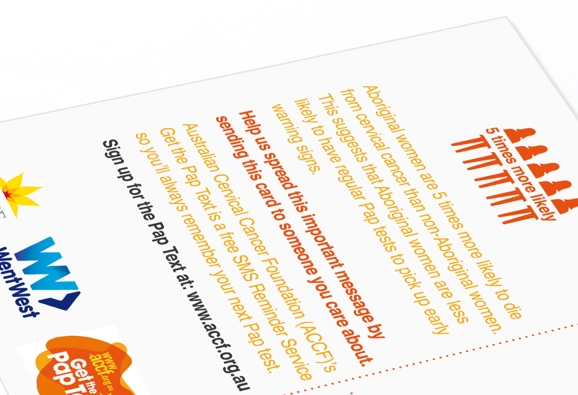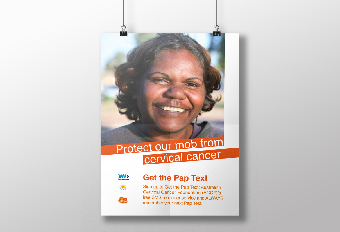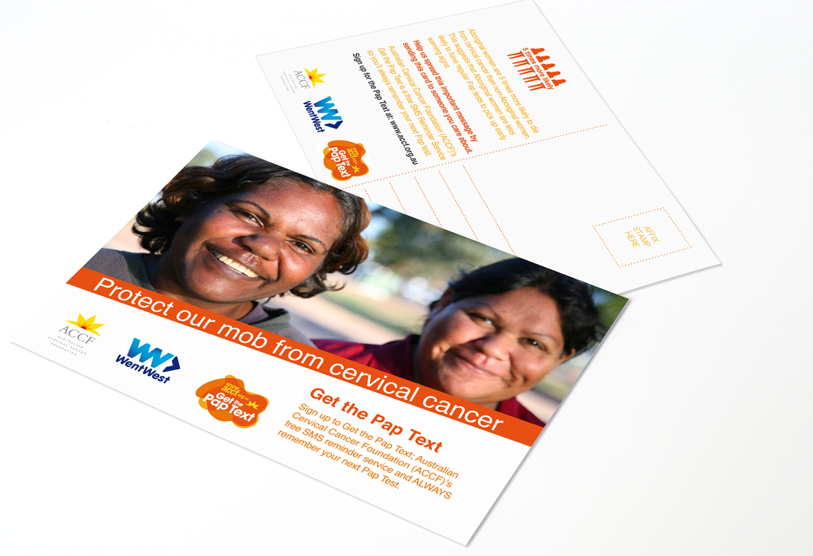 Our postcards and posters for the ‘Protect Our Mob from Cervical Cancer’ program were designed for the purpose of creating awareness of cervical cancer within indigenous Australian women, and to increase sign up rates for the ‘Get the Pap Text' program.